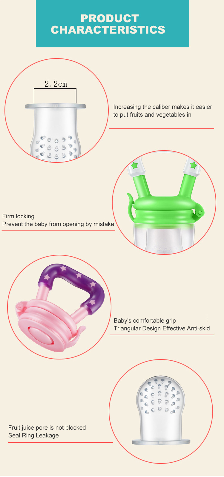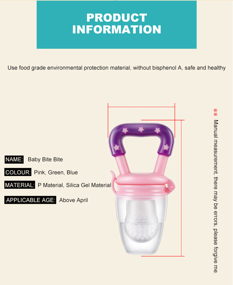 Product DescriptionItem name | 2021 Hot Sale BPA FREE Silicone Baby Fruit Feeder Pacifier |
