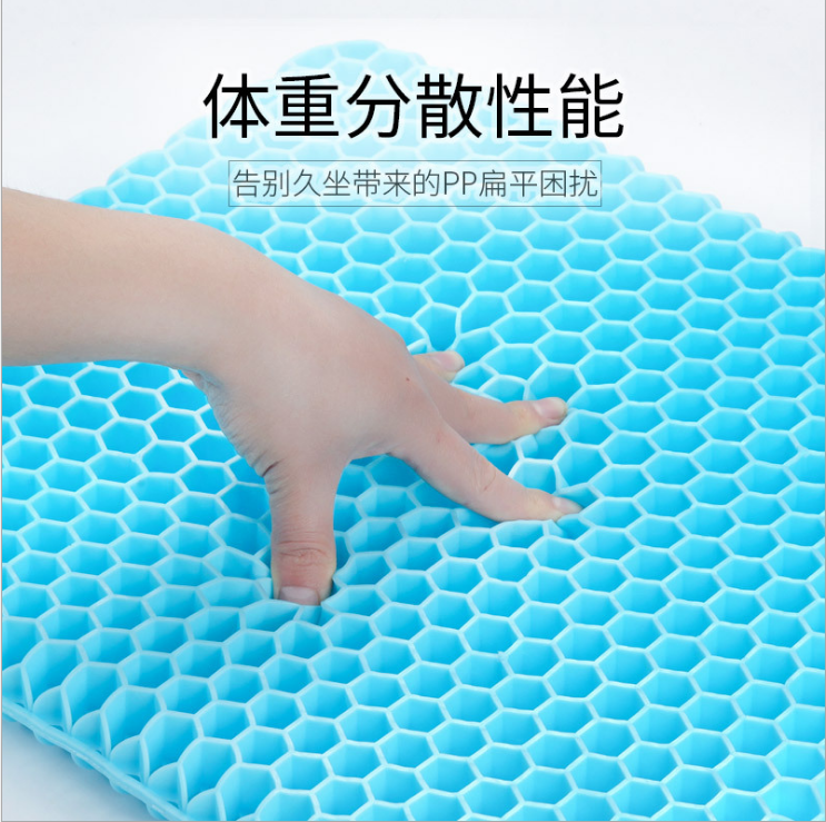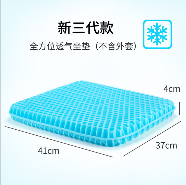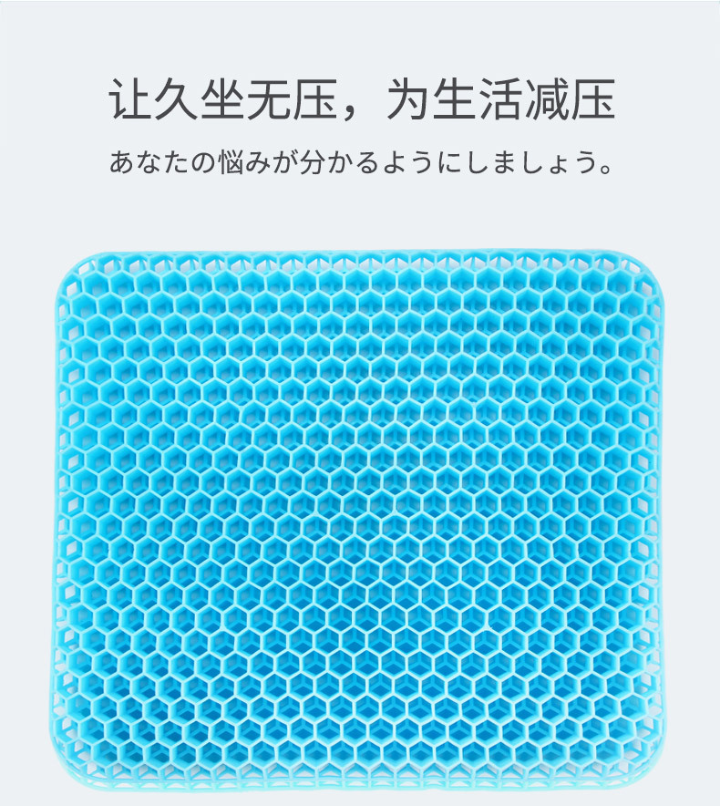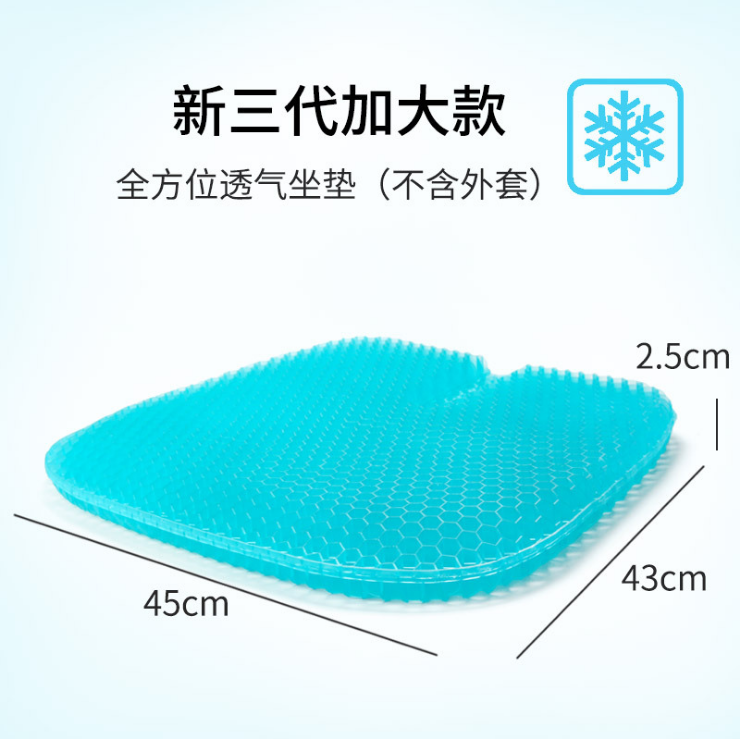 产品概要:高弹性凝胶坐垫,蜂巢式结构舒适透气无闷热感,柔韧性强不塌陷不变形。